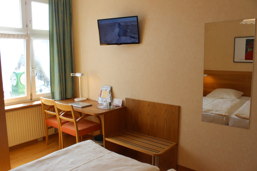 The small twin and double rooms SMALL are equipped with TV, telephone, shower, flatscreen HD TV and Wifi and are located in the old hotel wing. Here elm furniture, wooden floors and warm colours await you. They contain two single beds (90×200 cm), which are partly separated from each other in the room. On hot days we will gladly provide you with a fan to cool you down.