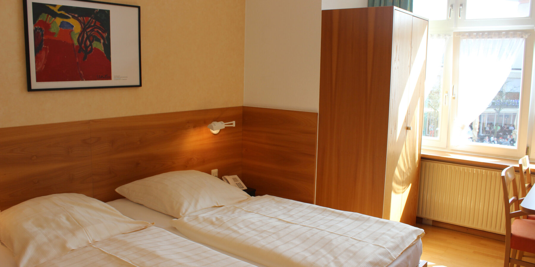 They are also all equipped with bathroom, flatscreen TV, desk and Wifi. You sleep comfortably in two single beds (90 cm x 200 cm).The small twin and double rooms SMALL are equipped with TV, telephone, shower, flatscreen HD TV and Wifi and are located in the old hotel wing. Here elm furniture, wooden floors and warm colours await you. They contain two single beds (90×200 cm), which are partly separated from each other in the room.