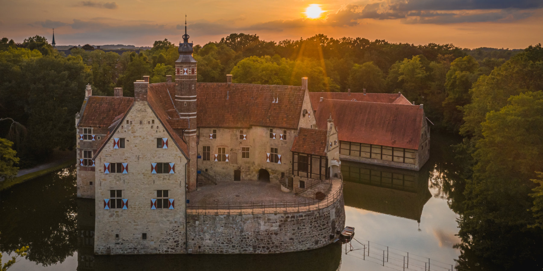 Im 18. Jahrhundert nach Plänen des Baumeisters Johann Conrad Schlaun errichtet, liegt das Wasserschloss mitten im Münsterland und ist von einer weitläufigen Parkanlage umringt, deren Besuch sich in jedem Falle lohnt. Aufgrund der Größe der Anlage und der barocken Gestaltung, ist es auch unter dem Namen „Westfälisches Versailles“ bekannt. Mit ca. 500.000 Besucher*innen pro Jahr (vor Corona) zählt es zu einer der beliebtesten Sehenswürdigkeiten in der Region und ist dennoch nicht überlaufen. Übrigens liegt es nur rund 14 km vom Hotel entfernt und ist entsprechend auch gut mit dem Fahrrad erreichbar. Café, Restaurant und Museum laden zu einem längeren Aufenthalt ein.